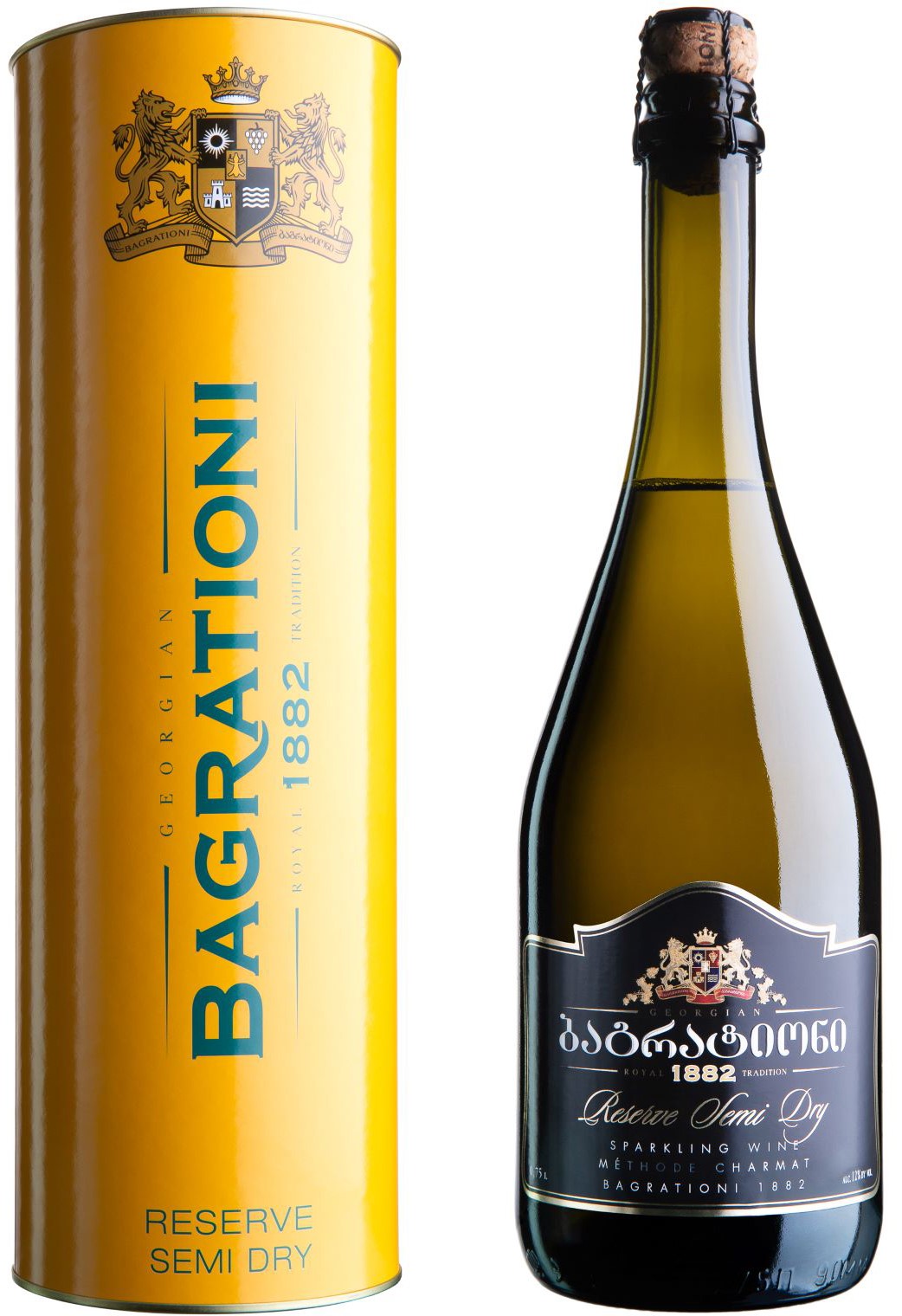Prírodné suché šumivé víno „Bagrationi Reserve Semi Dry“ je vyrobené z vybraného hrozna tradičných odrôd Chinuri, Goruli, Mtsvane a Thitska pestovaných v Gruzínsku. . Šumivé víno vyrobené prirodzeným kvasením, doba zrenia min. deväť mesiacov.