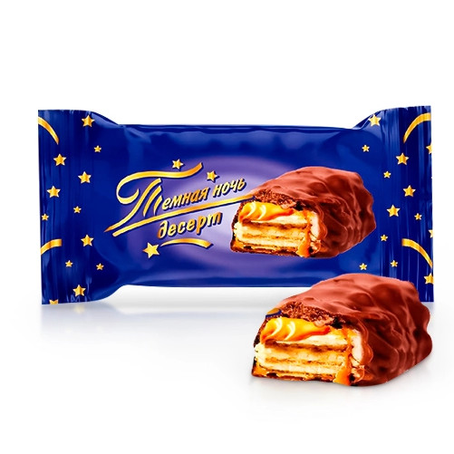 Oblátkový dezert „TEMNÁ NOC“ je chutná kombinácia chrumkavých oblátkových vrstiev a bohatej krémovej náplne s hlbokým čokoládovým tónom. Produkt je pokrytý tenkou vrstvou tmavej čokoládovej polevy, ktorá mu dodáva výnimočnú jemnosť, a jemná čerešňová náplň pridáva ľahkú kyslosť – výsledkom je harmonické spojenie chutí a textúr.