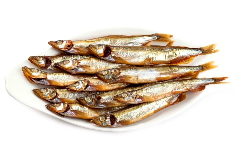 Složení: Huňáček severní (Mallotus villosus), sůl, regulátory kyseliny: E262, E260; kouř.