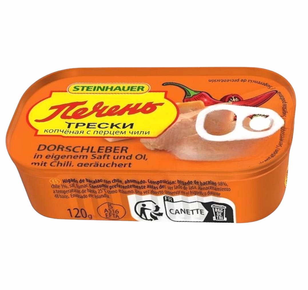Lahodná a aromatická tresčia pečeň údená horúcim dymom s prídavkom pikantnej chilli papričky. Má jemnú konzistenciu, pikantnú chuť a výraznú dymovú arómu. Je bohatá na zdravé tuky (omega-3), vitamíny A a D. Výborne sa hodí na chlebíky, do šalátov alebo ako samostatné občerstvenie.