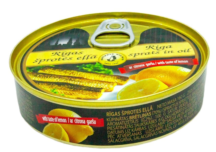 Složení: Uzené šproty 70%, jedlá sůl 1%, rostlinný olej 28,8%, příchuť citrónu 0,2%.