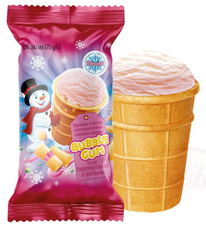 Zloženie: voda, cukor, kokosový tuk, sušené odstredené mlieko, téglik na vafle 6% (pšeničná múka, zemiakový škrob, repkový olej, cukor, emulgátor: sójový lecitín, soľ, kypriaca látka E500), maslo, glukózový sirup, emulgátor: E471, stabilizátory: E466, E412, E407; Farbivá: E162,E160a; Aróma.